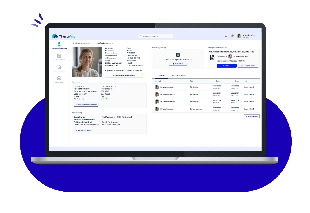 Die erfolgreiche interdisziplinäre Zusammenarbeit und die korrekte Abbildung der Komplexleistung erzeugen im Alltag hohen administrativen Aufwand. TheraVira wurde genau dafür konzipiert: als integrierte Softwarelösung für heilpädagogische und interdisziplinäre Frühförderstellen der Eingliederungshilfe.