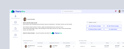 Die Webanwendung und App TheraVira begleitet Sie vom Erstgespräch bis zur Abrechnung. Vereinfachen Sie Ihre Abläufe in einem einheitlichen System – datenschutz­konform und mobil verfügbar.