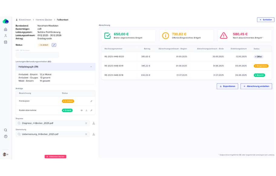 Ja, alle Prozesse greifen ineinander. Ihre Termine, Förderpläne und dokumentierten Einheiten bilden automatisch die Grundlage für die Leistungsnachweise – ohne doppelte Eingaben oder Medienbrüche.